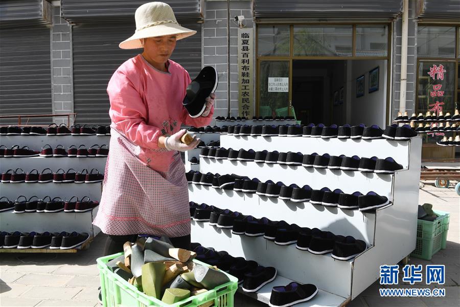 7月2日,臨夏縣百利布鞋加工農(nóng)民專業(yè)合作社員工在擺放布鞋。甘肅省臨夏回族自治州臨夏縣將布鞋加工定為重點扶持發(fā)展的產(chǎn)業(yè),采用“政府+公司+貧困戶”的產(chǎn)業(yè)扶貧模式,由政府主導、企業(yè)出資,在貧困村建設“扶貧車間”,吸納貧困群眾從事布鞋加工產(chǎn)業(yè)增加收入。截至2019年底,當?shù)夭夹庸て髽I(yè)和加工戶遍及近百個行政村,從業(yè)人員達到4000多人,累計生產(chǎn)布鞋600多萬雙,實現(xiàn)銷售收入2.32億元。新華社記者范培珅攝