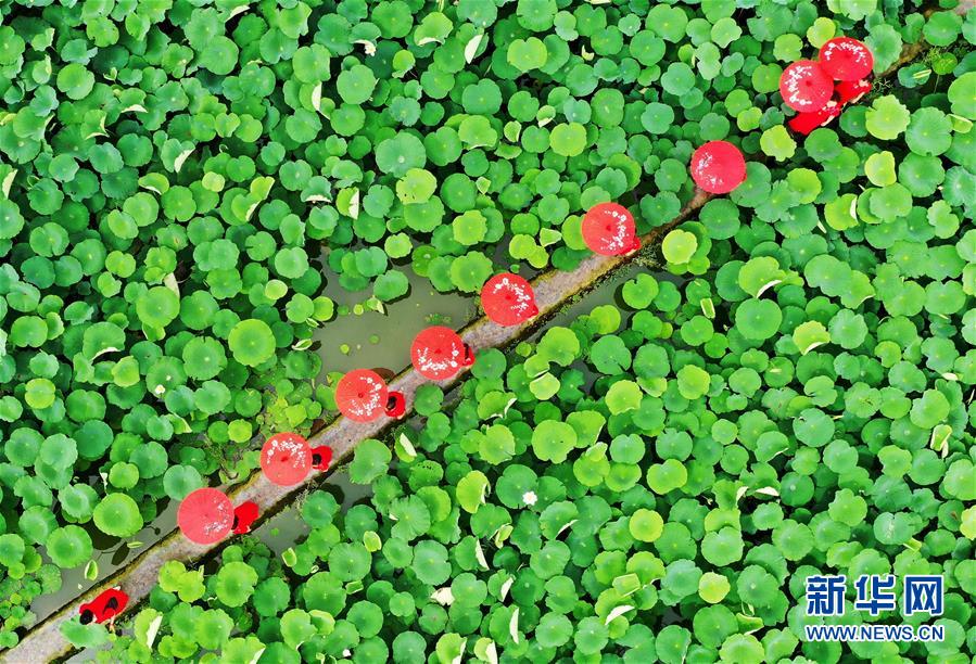 7月3日,游客在曲周縣勝豐蓮藕種植專業(yè)合作社荷塘景區(qū)游覽(無人機(jī)照片)。時(shí)值夏日,河北省曲周縣勝豐蓮藕種植專業(yè)合作社荷塘景區(qū)的荷花競(jìng)相綻放,吸引眾多游人前來觀光游覽。新華社記者 王曉 攝