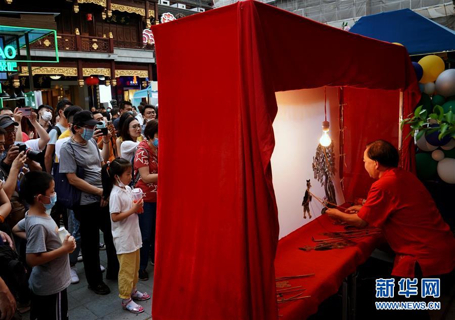 7月3日,游人在上海豫園中心廣場(chǎng)上觀看皮影表演。從7月第一個(gè)周末起,上海豫園原有的“豫園六點(diǎn)半”集市全面升級(jí),煥彩燈光、演藝活動(dòng)和花車(chē)集市全線(xiàn)更新,讓市民和游客在觀燈、觀人、觀演的沉浸式體驗(yàn)中,享受夏日特色的“食玩”樂(lè)趣。新華社記者 劉穎 攝