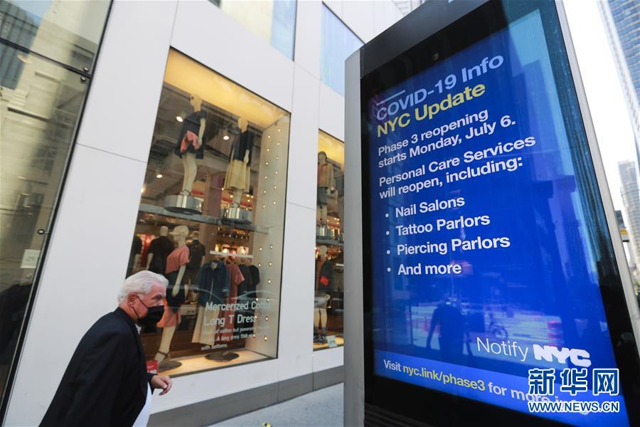7月4日,一名行人從美國(guó)紐約第五大道顯示新冠疫情最新情況的信息屏旁經(jīng)過(guò)。當(dāng)日是美國(guó)獨(dú)立日,美國(guó)多地疫情仍面臨嚴(yán)峻形勢(shì)。美國(guó)約翰斯·霍普金斯大學(xué)實(shí)時(shí)統(tǒng)計(jì)數(shù)據(jù)顯示,美國(guó)累計(jì)新冠確診病例4日已超過(guò)280萬(wàn)例。新華社記者王迎攝