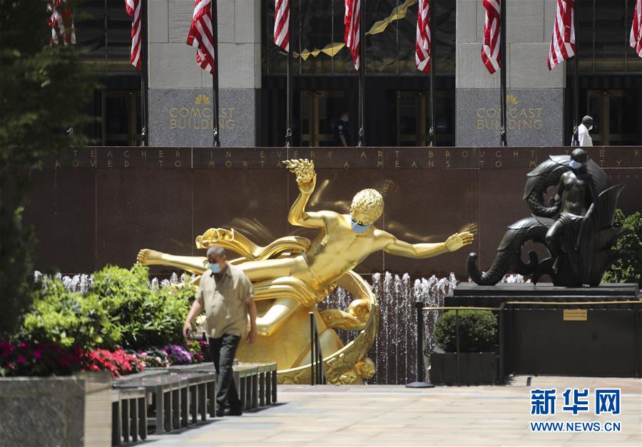 7月4日,一名男子從美國(guó)紐約洛克菲勒中心一尊戴口罩的雕像前走過(guò)。當(dāng)日是美國(guó)獨(dú)立日,美國(guó)多地疫情仍面臨嚴(yán)峻形勢(shì)。美國(guó)約翰斯·霍普金斯大學(xué)實(shí)時(shí)統(tǒng)計(jì)數(shù)據(jù)顯示,美國(guó)累計(jì)新冠確診病例4日已超過(guò)280萬(wàn)例。新華社記者王迎攝
