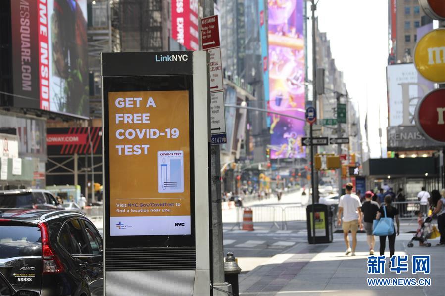 這是7月4日在美國(guó)紐約時(shí)報(bào)廣場(chǎng)附近拍攝的顯示新冠檢測(cè)信息的顯示屏。當(dāng)日是美國(guó)獨(dú)立日,美國(guó)多地疫情仍面臨嚴(yán)峻形勢(shì)。美國(guó)約翰斯·霍普金斯大學(xué)實(shí)時(shí)統(tǒng)計(jì)數(shù)據(jù)顯示,美國(guó)累計(jì)新冠確診病例4日已超過(guò)280萬(wàn)例。新華社記者王迎攝