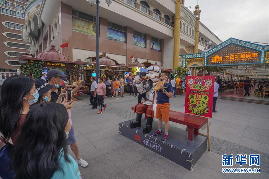 游客在烏魯木齊大巴扎美食街前拍照留念(7月4日攝)。夏日周末,烏魯木齊市大巴扎景區(qū)內(nèi)熙熙攘攘,人們來到這里品嘗美食、休閑購物。2018年,經(jīng)過靚化改造后的大巴扎景區(qū)新增長約800米的步行街,分為文創(chuàng)文旅和“非遺”項目街區(qū)、國際時尚街區(qū)和大巴扎美食街區(qū),是烏魯木齊最受歡迎的旅游目的地之一。新華社記者趙戈攝