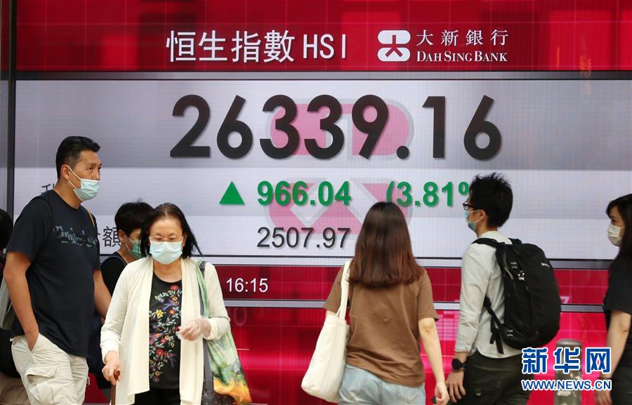 7月6日,人們從位于香港中環(huán)的股市信息屏前經(jīng)過。香港恒生指數(shù)6日漲966.04點,漲幅3.81%,收報26339.16點。全日主板成交2507.97億港元。新華社記者李鋼攝