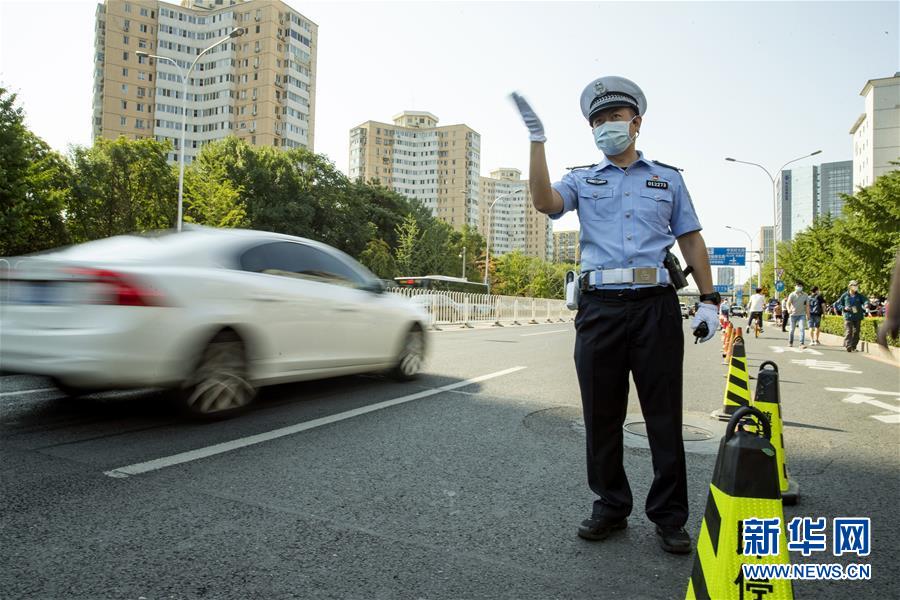 7月7日,在位于北京的中國人民大學附屬中學考點外,北京市公安局公安交通管理局海淀交通支隊中關(guān)村大隊交警付云輝在指揮車輛有序行駛。當日,2020年高考拉開帷幕。新華社記者沈伯韓攝
