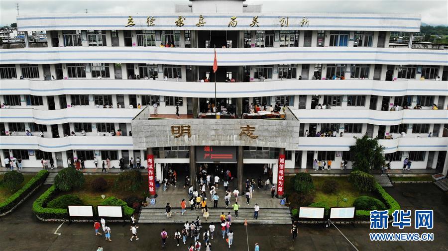 7月9日,考生進入歙縣第二中學(xué)考點(無人機照片)。受強降雨影響,2020年高考安徽歙縣考區(qū)7月7日未能如期開考,經(jīng)研究并報教育部批準,歙縣考區(qū)于9日啟用2020年普通高等學(xué)校招生全國統(tǒng)一考試語文、數(shù)學(xué)(文、理)科目副題進行考試。新華社記者黃博涵攝