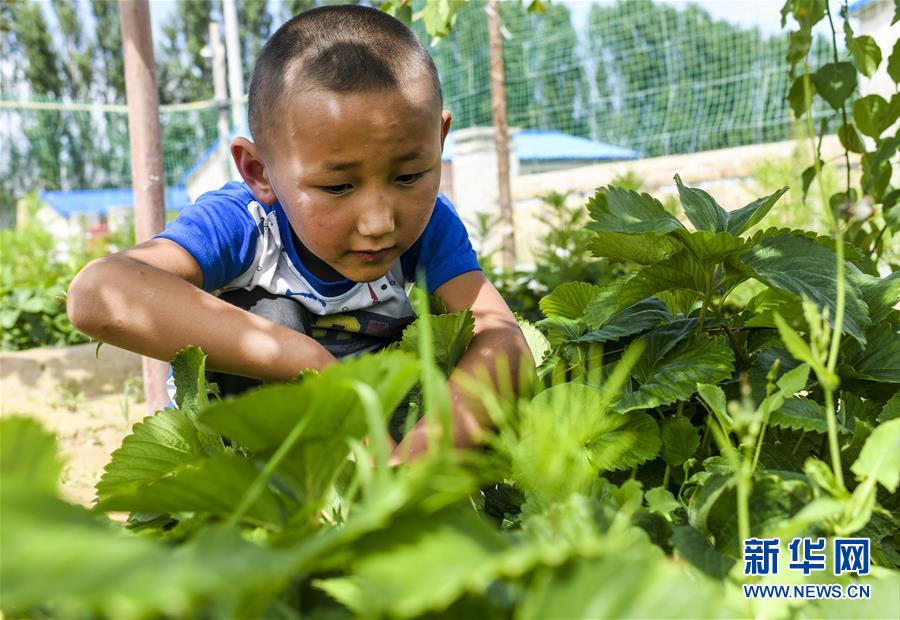 在新疆特克斯縣境內(nèi)的牧民定居點,一名小朋友幫家人采摘自家種植的水果(7月6日攝)。新華社記者王菲攝