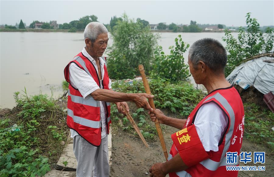 7月9日,在高淳區(qū)陽江鎮(zhèn)永豐圩,巡堤員在進行“水牌”(巡堤查險責任牌)交接。新華社記者季春鵬攝