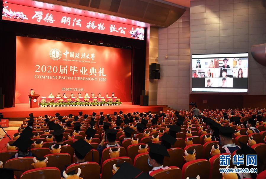 7月10日拍攝的中國(guó)政法大學(xué)2020屆畢業(yè)典禮現(xiàn)場(chǎng)。當(dāng)日,中國(guó)政法大學(xué)舉行2020屆畢業(yè)典禮。由于疫情防控需要,僅少量在校畢業(yè)生在中國(guó)政法大學(xué)昌平校區(qū)禮堂現(xiàn)場(chǎng)參加畢業(yè)典禮,更多畢業(yè)生通過線上直播參與。新華社記者任超攝