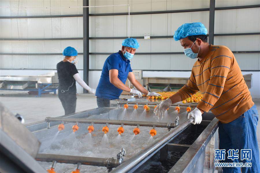 在新疆英吉沙縣一家合作社內(nèi),員工在清洗杏子(7月2日攝)。新華社記者高晗攝