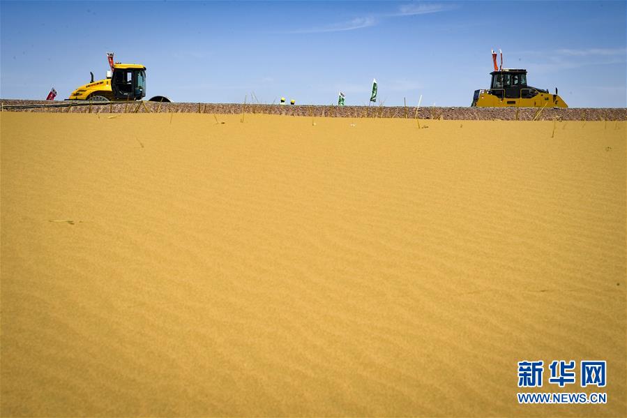 烏瑪高速青銅峽至中衛(wèi)段穿越騰格里沙漠的18公里路段,與中國(guó)首條沙漠鐵路——包蘭鐵路交匯(7月10日攝,無(wú)人機(jī)照片)。盛夏時(shí)節(jié),位于寧夏境內(nèi)的烏瑪(內(nèi)蒙古烏海市至青?,斍呖h)高速青銅峽至中衛(wèi)段正在抓緊施工建設(shè)。該路段主線全長(zhǎng)122.9公里,其中穿越騰格里沙漠腹地的18公里公路是寧夏建設(shè)的首條沙漠高速公路,預(yù)計(jì)2021年建成通車(chē)。新華社記者馮開(kāi)華攝。