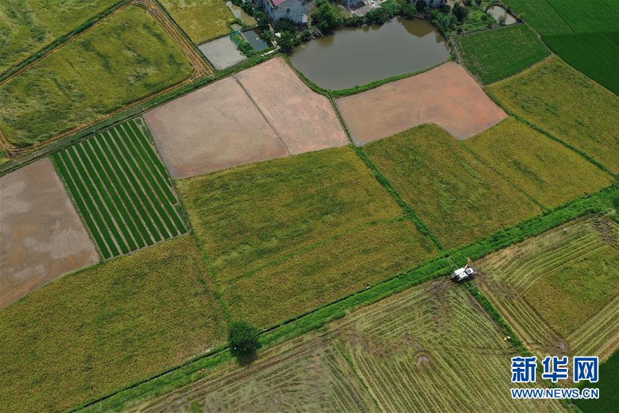 7月11日,在湖南省衡陽市衡陽縣臺源鎮(zhèn)臺九村,村民駕駛收割機(jī)收割早稻(無人機(jī)照片)。近日,湖南各地農(nóng)村陸續(xù)進(jìn)入“雙搶”季,農(nóng)民緊抓農(nóng)時,搶收搶種,力爭糧食穩(wěn)產(chǎn)豐收。新華社記者趙眾志攝