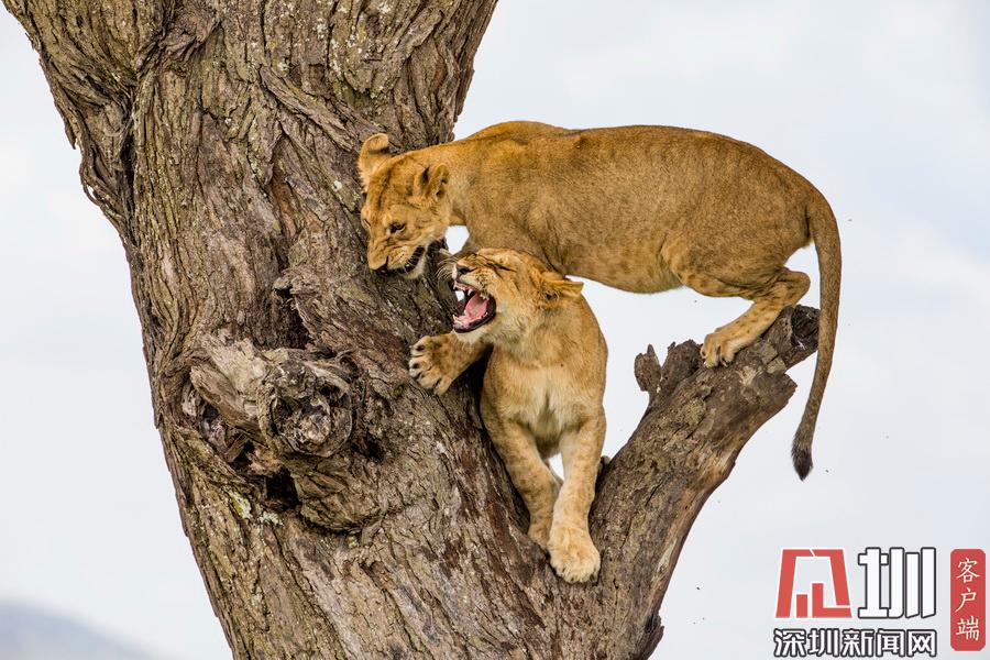 2020年7月13日?qǐng)?bào)道(具體拍攝時(shí)間不詳),Sandesh Kadur是一名印度野生動(dòng)物攝影師,他在坦桑尼亞塞倫蓋蒂?lài)?guó)家公園拍攝到一系列“獅子上樹(shù)”的精彩照片。畫(huà)面中,有一只憤怒的母獅為了捍衛(wèi)自己在樹(shù)上的位置,一邊劈叉一邊對(duì)著鏡頭咆哮,有兩只獅子為了爭(zhēng)奪位置互相攻擊,還有一只獅子在找到舒適的位置后呼呼大睡。