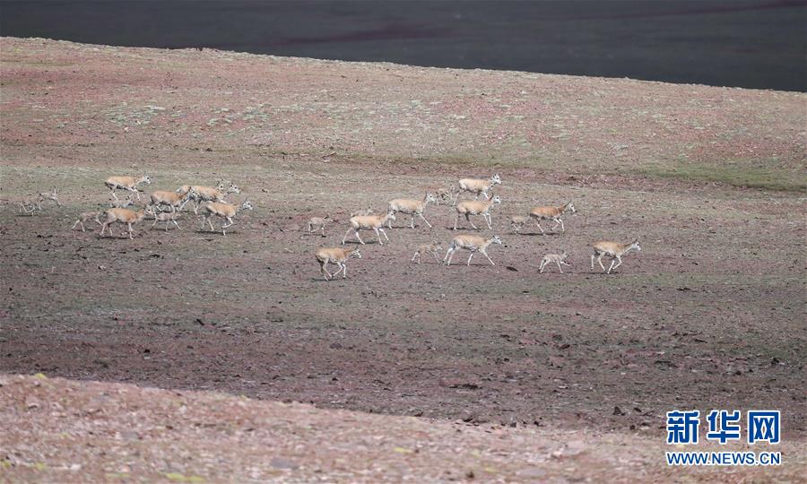 7月7日在可可西里卓乃湖區(qū)域拍攝的一群藏羚羊。目前正值藏羚羊產(chǎn)仔季。來自青海三江源、新疆阿爾金山、西藏羌塘等地的藏羚羊來到位于青海省可可西里腹地、被譽為“藏羚羊大產(chǎn)房”的卓乃湖區(qū)域產(chǎn)仔。新華社記者 薛玉斌 攝