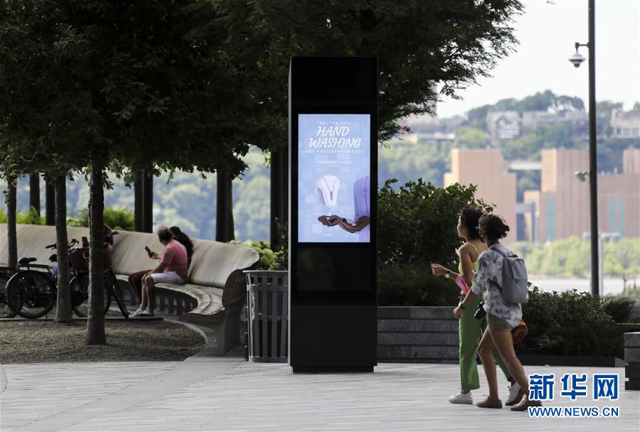 7月14日,在美國紐約一家尚未恢復店內購物的購物中心外,電子屏介紹正確洗手的方式。美國約翰斯·霍普金斯大學:截至北京時間15日6時34分,全球新冠確診病例達13258016例,死亡病例為576752例。美國是全球疫情最嚴重的國家,確診病例達3416222例,死亡病例為136319例。新華社記者 王迎 攝