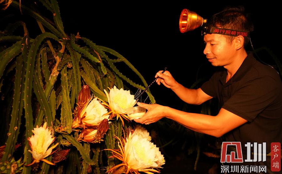 廣西融水:火龍果果農(nóng)夏夜“點(diǎn)花”忙