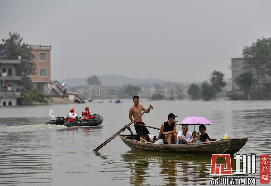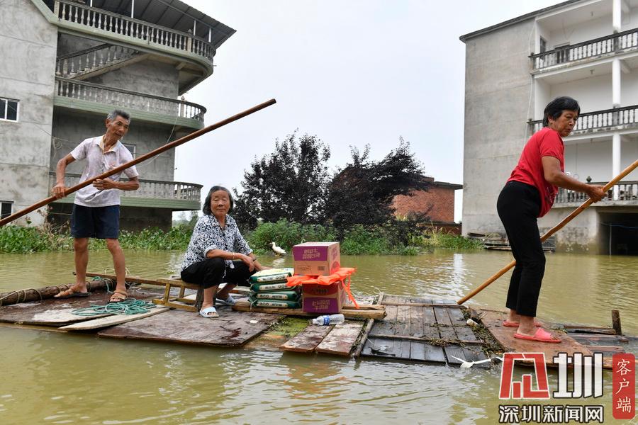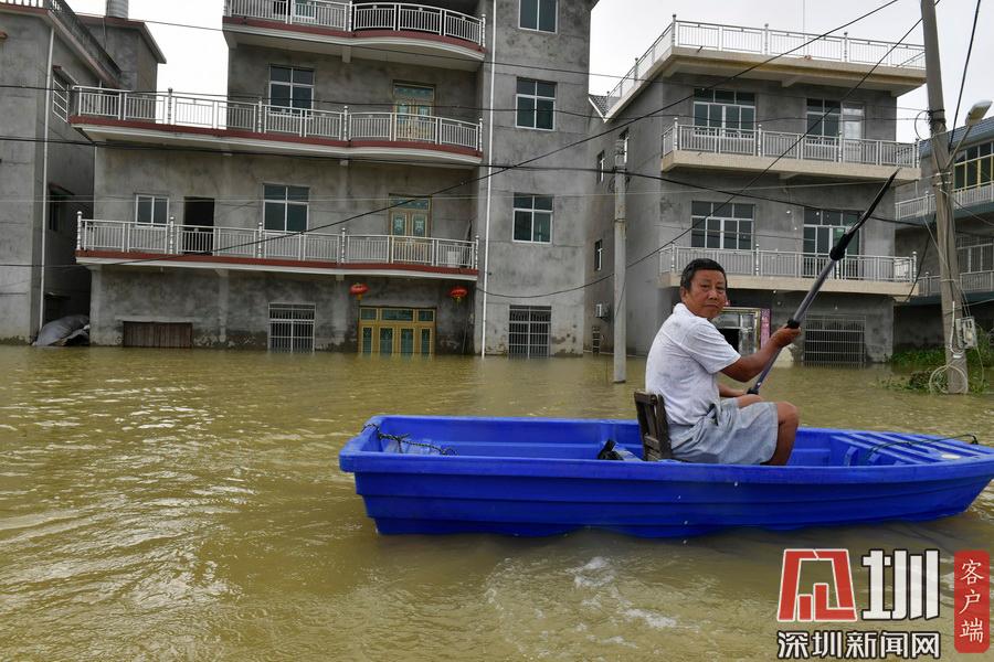 江西鄱陽村莊洪水圍困 留守村民劃船外出取生活物資