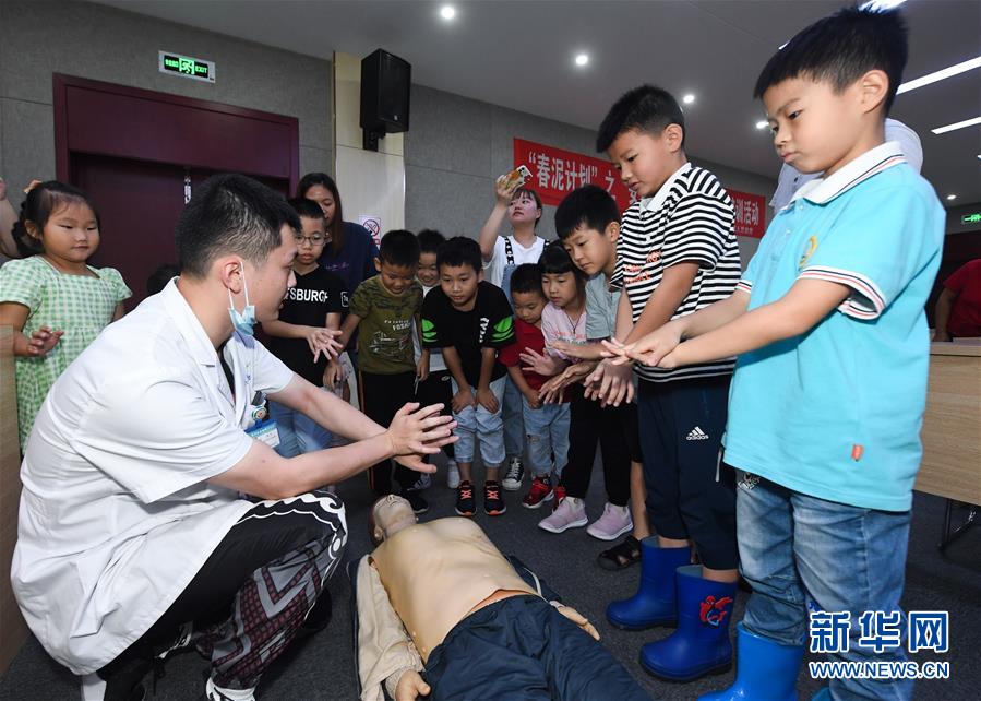 7月16日,學(xué)生們?cè)跂|林鎮(zhèn)衛(wèi)生院醫(yī)護(hù)人員的示范和講解下學(xué)習(xí)正確洗手的方法。當(dāng)日,浙江省湖州市吳興區(qū)東林鎮(zhèn)舉辦暑期“安全防護(hù)小超人”主題活動(dòng)?;顒?dòng)由醫(yī)護(hù)人員、消防隊(duì)員等為學(xué)生及家長(zhǎng)講授日常安全避險(xiǎn)及溺水急救知識(shí),中小學(xué)們還在現(xiàn)場(chǎng)學(xué)習(xí)了簡(jiǎn)易包扎、心肺復(fù)蘇的正確方式,并了解滅火器、滅火毯等消防器材的使用,為學(xué)生平安過(guò)暑期打好安全防護(hù)“預(yù)防針”。新華社記者 徐昱 攝
