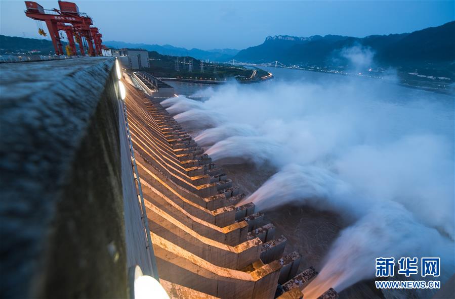 7月19日,三峽樞紐開(kāi)啟泄洪深孔泄洪。19日20時(shí),三峽水庫(kù)入庫(kù)流量4.6萬(wàn)立方米/秒,較本輪洪水的峰值6.1萬(wàn)立方米/秒下降了1.5萬(wàn)立方米/秒?!伴L(zhǎng)江2020年第2號(hào)洪水”平穩(wěn)通過(guò)三峽大壩。新華社記者肖藝九攝