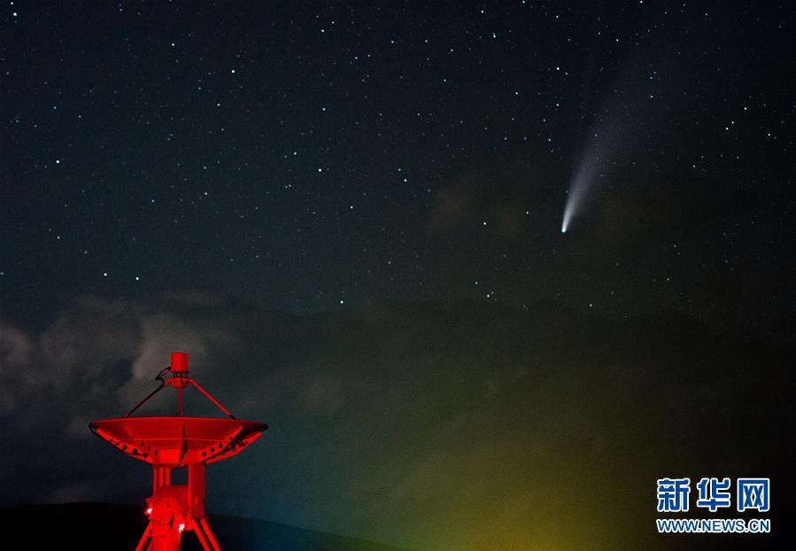 7月18日晚,在明安圖觀測基地,尼歐懷茲彗星劃過天際。7月18日晚至19日凌晨,在位于內(nèi)蒙古錫林郭勒盟正鑲白旗境內(nèi)的國家天文臺明安圖觀測基地,尼歐懷茲彗星劃過天際。在明安圖觀測基地內(nèi),排列著100面白色的拋物面天線。這個龐大的天線陣列便是草原“天眼”——明安圖射電頻譜日像儀。草原“天眼”持續(xù)接收太陽射電輻射,然后由科研人員進(jìn)行數(shù)據(jù)分析研究,對空間環(huán)境監(jiān)測、太陽活動預(yù)報均有重要作用。新華社記者連振攝