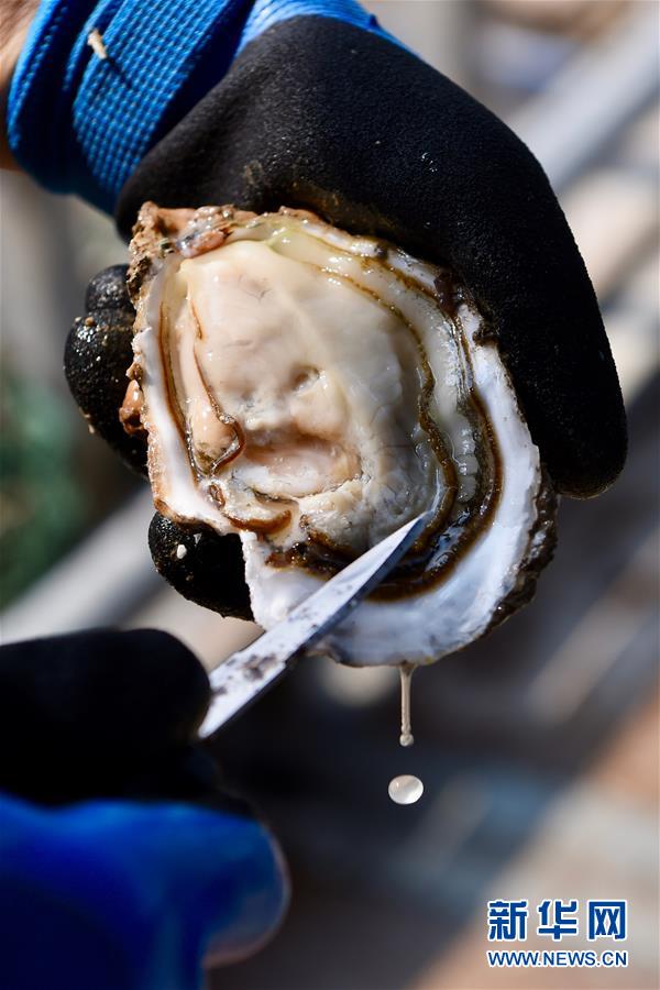 7月16日,福建省霞浦縣長春鎮(zhèn)秋竹崗村養(yǎng)殖大戶俞開明展示一粒成熟的三倍體生蠔。新華社記者姜克紅攝