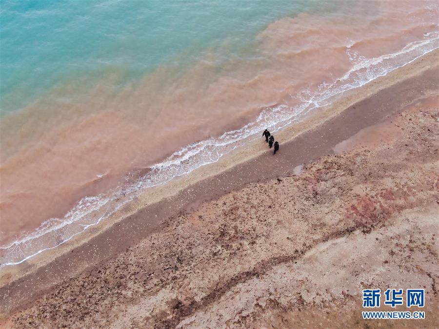 在可可西里索南達(dá)杰保護(hù)站管護(hù)區(qū)域內(nèi)的湖泊附近,龍周才加(中)與隊(duì)友才仁多杰(左)、王文豪在巡視(6月30日攝,無(wú)人機(jī)照片)。新華社記者張龍攝