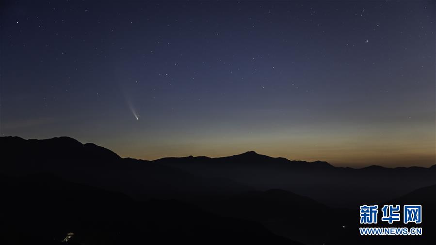 7月16日凌晨,在北京郊區(qū)拍攝的尼歐懷茲彗星劃過(guò)天際。新華社記者孟鼎博攝