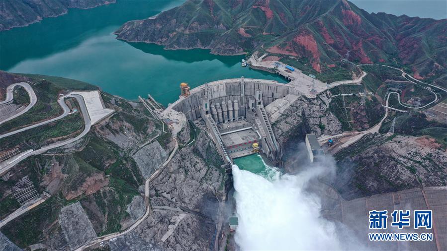 7月9日,位于青海省尖扎縣和化隆縣交界處的李家峽水電站提門(mén)泄水(無(wú)人機(jī)照片)。新華社記者吳剛攝