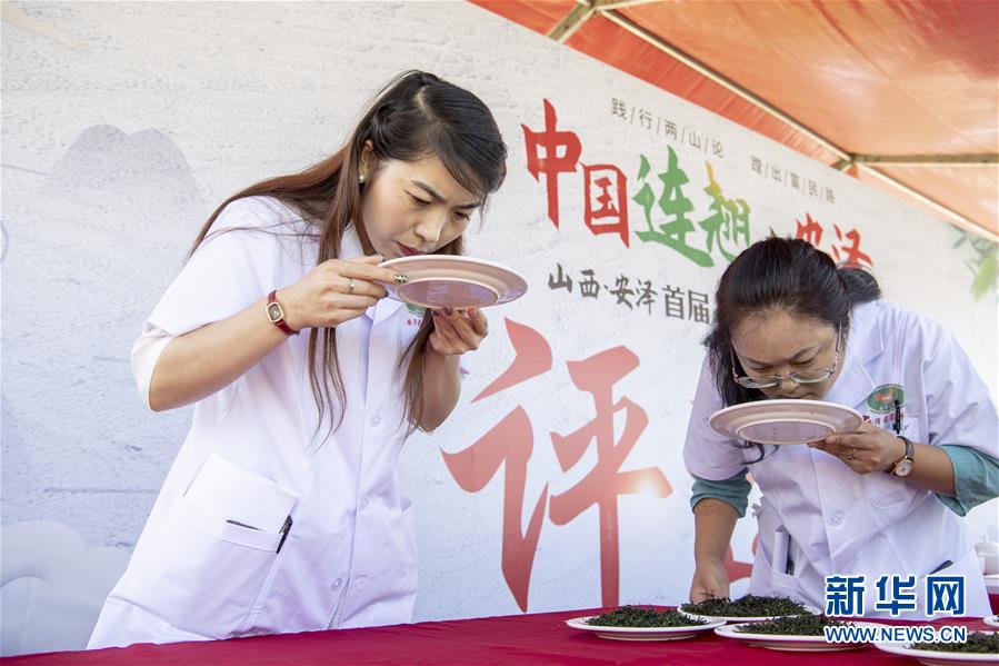 7月20日,在位于安澤縣飛嶺村的斗茶文化主題活動(dòng)現(xiàn)場(chǎng),比賽評(píng)委對(duì)制成的茶葉進(jìn)行評(píng)審。新華社記者楊晨光攝