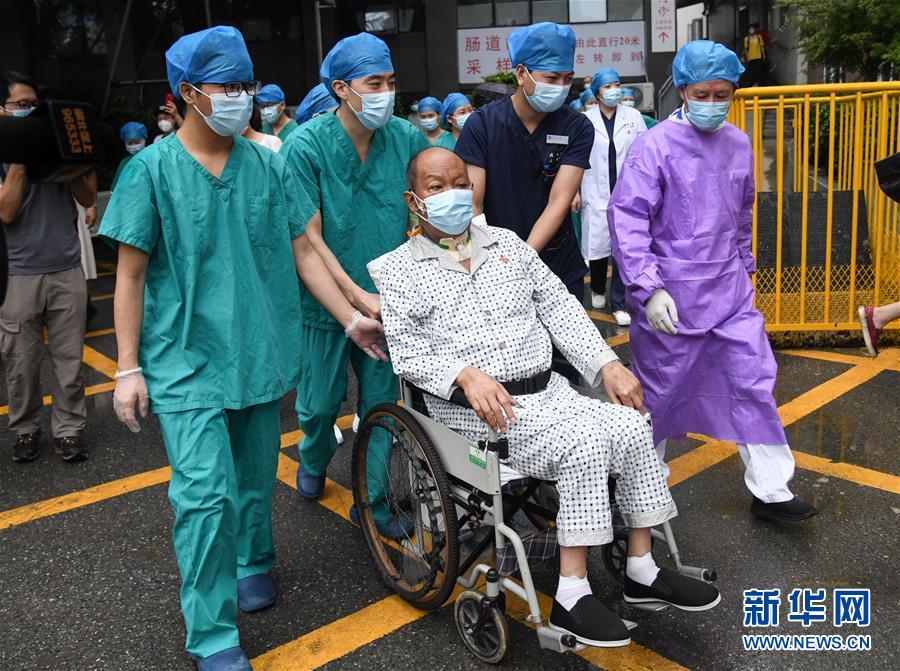 7月21日,武漢大學(xué)人民醫(yī)院醫(yī)護人員護送崔先生出院。新華社記者程敏攝