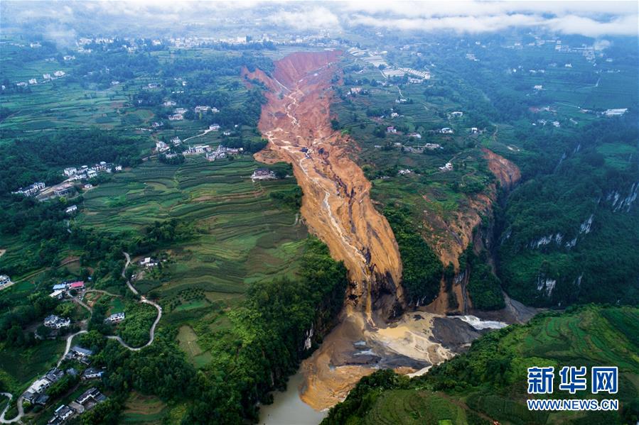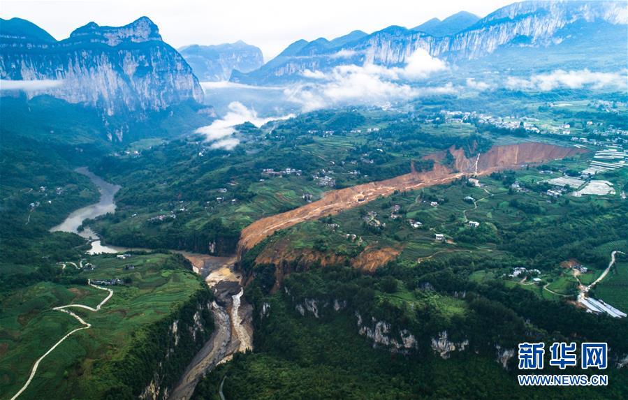 7月22日拍攝的因恩施州屯堡鄉(xiāng)馬者村山體滑坡形成的堰塞湖(無人機照片)。