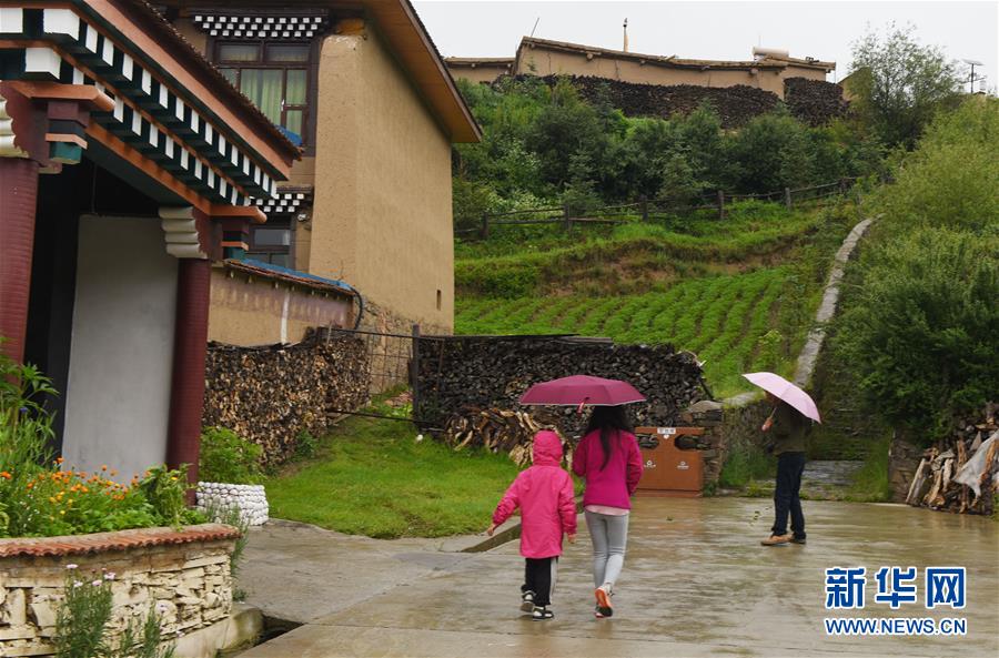 7月5日,來自成都的游客在阿壩縣查理鄉(xiāng)神座村游玩。新華社記者陳燮攝