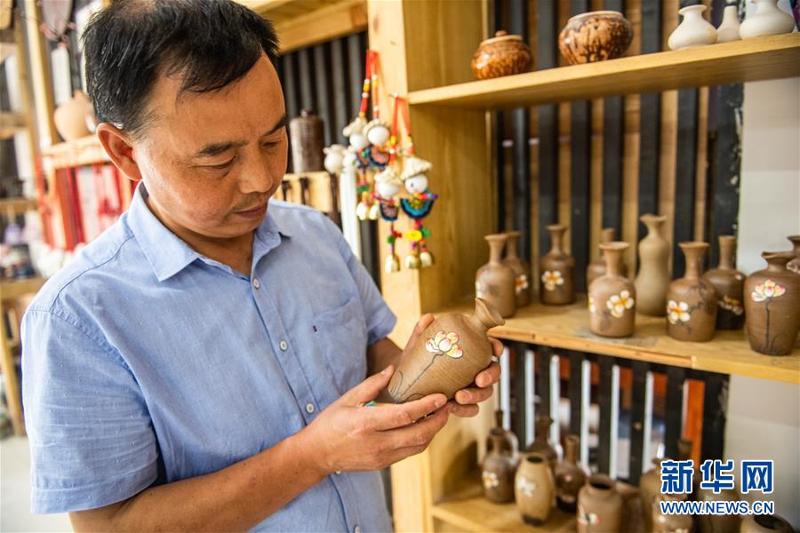 母先才在查看售賣的陶器產(chǎn)品(6月16日攝)。新華社記者 陶亮 攝