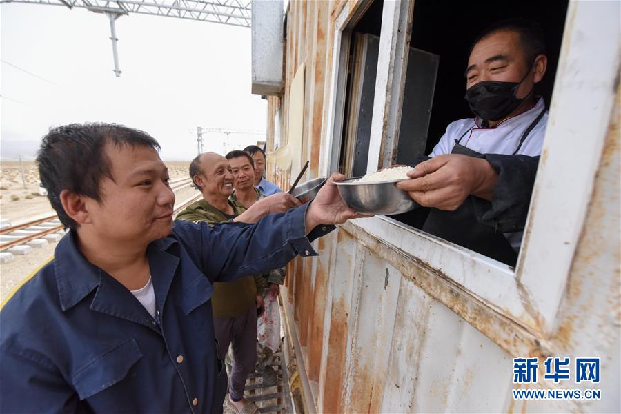 在索爾庫里宿營地,中鐵一局的施工人員在“白皮列車”內(nèi)吃午飯(7月19日攝)。新華社記者 丁磊 攝