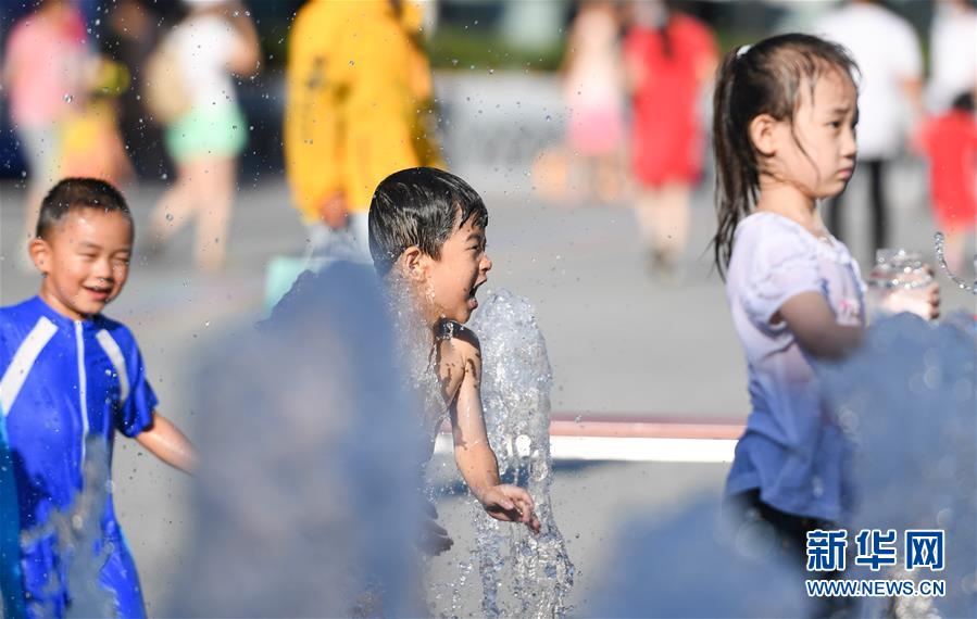 7月24日,孩子們?cè)诒本┤A熙LIVE·五棵松商業(yè)街區(qū)的一處噴泉戲水。北京市氣象局7月24日傍晚發(fā)布稱,24日截至16時(shí)30分,平原大部分地區(qū)出現(xiàn)37℃以上高溫天氣,局地氣溫超過40℃。北京市已于23日發(fā)布高溫藍(lán)色預(yù)警,預(yù)計(jì)25日全市大部分地區(qū)日最高氣溫仍將達(dá)35℃以上。新華社記者陳曄華攝