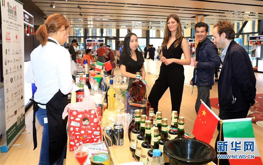 2020年5月8日,虹橋品匯國別文化節(jié)云游意大利主題展在上海虹橋進(jìn)口商品展示交易中心舉行,嘉賓在一家意大利酒類企業(yè)的展臺前駐足觀看。新華社記者 方喆 攝