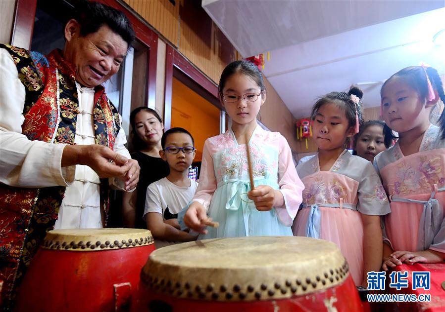 7月26日,在石家莊市橋西區(qū)休門街道休門西街社區(qū),休門吹歌傳承人付錫芬(左一)在指導(dǎo)小朋友敲鼓技巧。當(dāng)日,河北省石家莊市橋西區(qū)暑期“非遺”小課堂開(kāi)班。河北省級(jí)非物質(zhì)文化遺產(chǎn)休門吹歌傳承人走進(jìn)休門街道休門西街社區(qū),為轄區(qū)小朋友講解休門吹歌歷史,傳授非遺技藝,豐富他們的暑期生活。新華社記者 王曉 攝