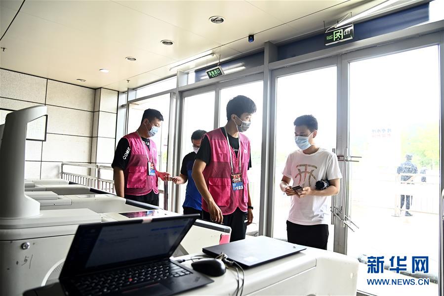 7月26日,在青島國信體育館,蘇柯帆(右)正在進(jìn)場。他成為CBA聯(lián)賽允許觀眾現(xiàn)場觀賽后,首位進(jìn)場的觀眾。當(dāng)日,在山東青島舉行的2019-2020賽季中國男子籃球職業(yè)聯(lián)賽(CBA)復(fù)賽第二階段(嶗山賽區(qū))比賽中,醫(yī)護(hù)人員、教師、公安戰(zhàn)線人士通過官方購票平臺,完成包括核酸檢測在內(nèi)的相關(guān)流程后進(jìn)場觀看了上海久事隊(duì)迎戰(zhàn)山東西王隊(duì)的比賽。觀賽期間,觀賽者須全程佩戴口罩,對號入座,嚴(yán)格保持間隔一米就座。退場時(shí),觀眾須按照自后向前、先兩邊后中間的順序,保持“一米線”社交距離有序退場。新華社記者 郭緒雷 攝