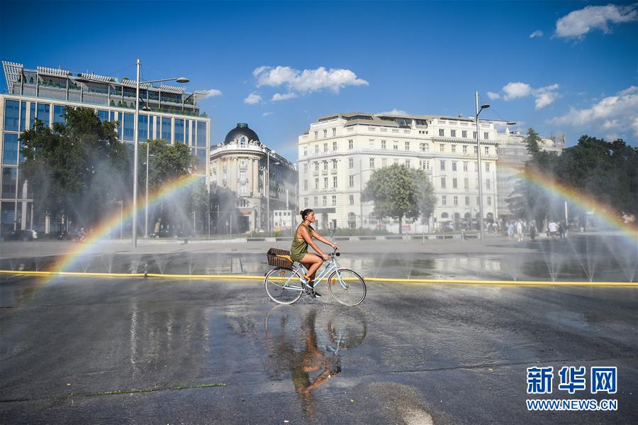 7月28日,在奧地利維也納,一名女子騎車經(jīng)過一處廣場的噴水設(shè)施。新華社記者郭晨攝