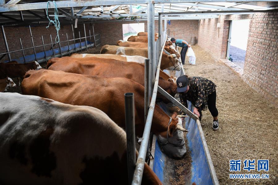呼格吉勒(后)和妻子薩如拉在自家牛舍給母牛喂飼料(7月23日攝)。新華社記者劉磊攝