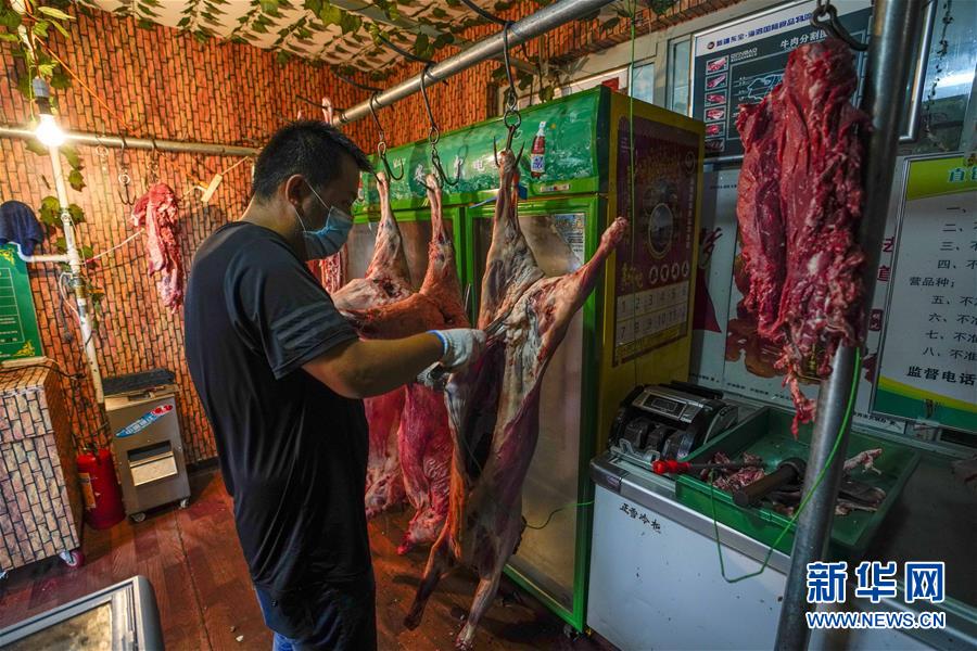 7月30日,在烏魯木齊經(jīng)濟(jì)技術(shù)開(kāi)發(fā)區(qū)(頭屯河區(qū))天鵝湖社區(qū)牛羊肉直銷(xiāo)點(diǎn),商販在分割新鮮羊肉。新華社記者趙戈攝