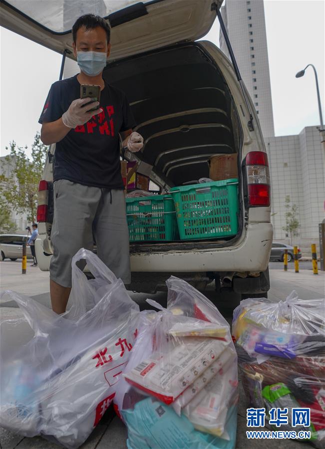 7月30日,在烏魯木齊經(jīng)濟(jì)技術(shù)開(kāi)發(fā)區(qū)(頭屯河區(qū))天鵝湖社區(qū)一家超市,商販按照住戶的訂單配送果蔬。新華社記者趙戈攝