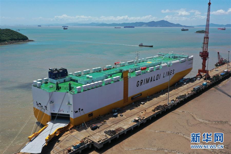 8月1日在位于螞蟻島的揚(yáng)帆集團(tuán)東海岸造船廠(chǎng)拍攝的一艘在建的汽車(chē)滾裝船,月底即將交付給意大利客戶(hù)(無(wú)人機(jī)照片)。新華社記者黃宗治攝