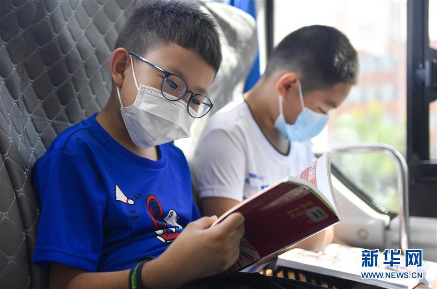8月5日,小讀者在“流動圖書館”里看書。三千冊圖書,一輛大巴車,穿梭在城市的街頭巷尾。在吉林長春,長春市圖書館利用流動圖書車,定期在市內15個固定服務點間巡回流動,為市民提供便捷的圖書借閱服務。新華社記者許暢攝