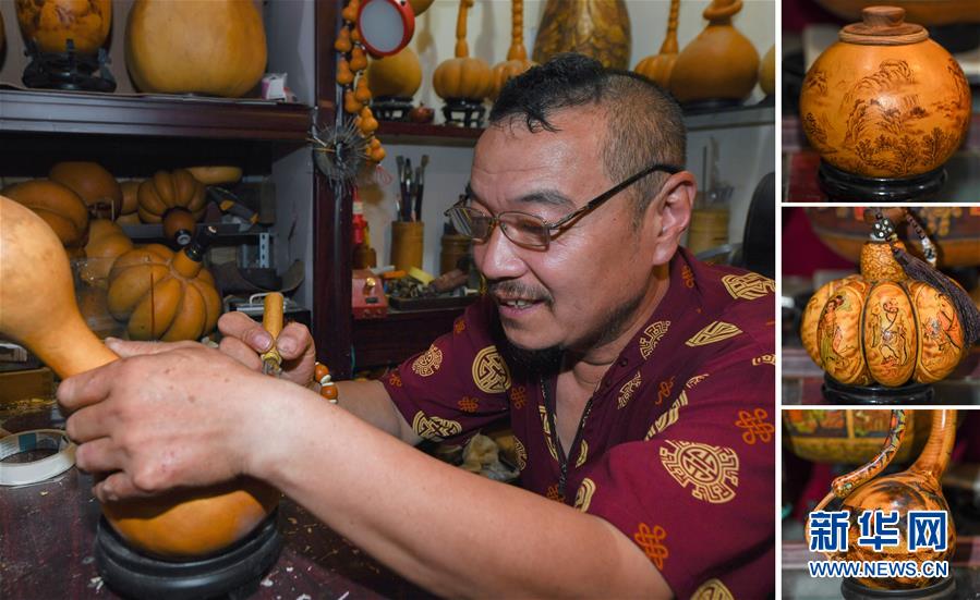 這是一張拼版照片。左:8月5日,侯景偉在葫蘆上進(jìn)行創(chuàng)作。右:侯景偉創(chuàng)作的葫蘆工藝品(8月5日攝)。今年55歲的吉林四平人侯景偉自幼與家人學(xué)習(xí)雕刻、烙畫藝術(shù)。經(jīng)過多年潛心研究,他將浮雕和烙畫工藝相結(jié)合,通過拋光、起稿、雕刻、烙燙、套色等十余道工藝,制作展現(xiàn)傳統(tǒng)文化、民俗故事的葫蘆工藝品。2020年,侯景偉被評為四平市非物質(zhì)文化遺產(chǎn)項目侯氏葫蘆雕刻烙畫代表性傳承人。他說:“希望有更多人加入到非遺傳承隊伍中,讓小葫蘆‘講’出更多民俗故事?!毙氯A社記者張楠攝