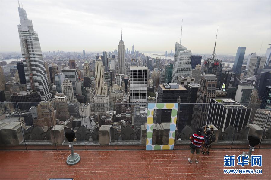 8月6日,在美國紐約,人們在洛克菲勒中心觀景臺上觀看城市景觀。當日,3月份暫時關(guān)閉的洛克菲勒中心觀景臺恢復(fù)對公眾開放。每天13時至21時,人們可戴口罩前往參觀。新華社記者王迎攝