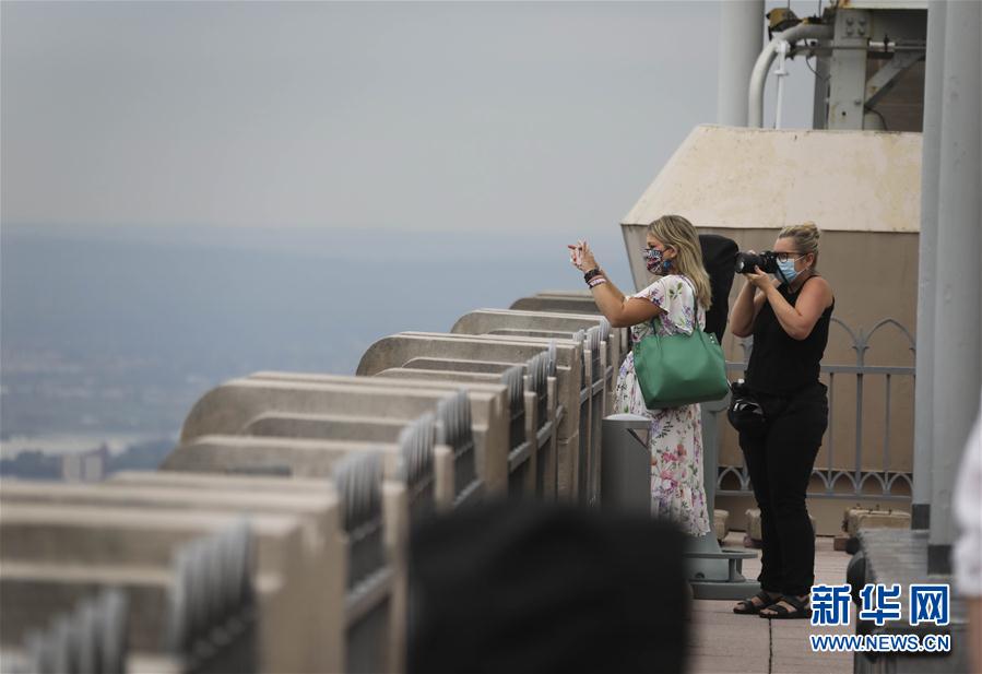 8月6日,在美國紐約,人們在洛克菲勒中心觀景臺上拍攝城市景觀。當日,3月份暫時關(guān)閉的洛克菲勒中心觀景臺恢復對公眾開放。每天13時至21時,人們可戴口罩前往參觀。新華社記者王迎攝