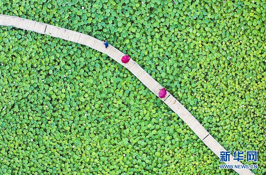 8月6日,游客在河北省永清縣里瀾城鎮(zhèn)金華湖觀賞荷花(無人機照片)。夏日時節(jié),河北省永清縣里瀾城鎮(zhèn)金華湖荷塘的荷花爭相開放,吸引市民和游客前來游玩觀賞。新華社記者李曉果攝