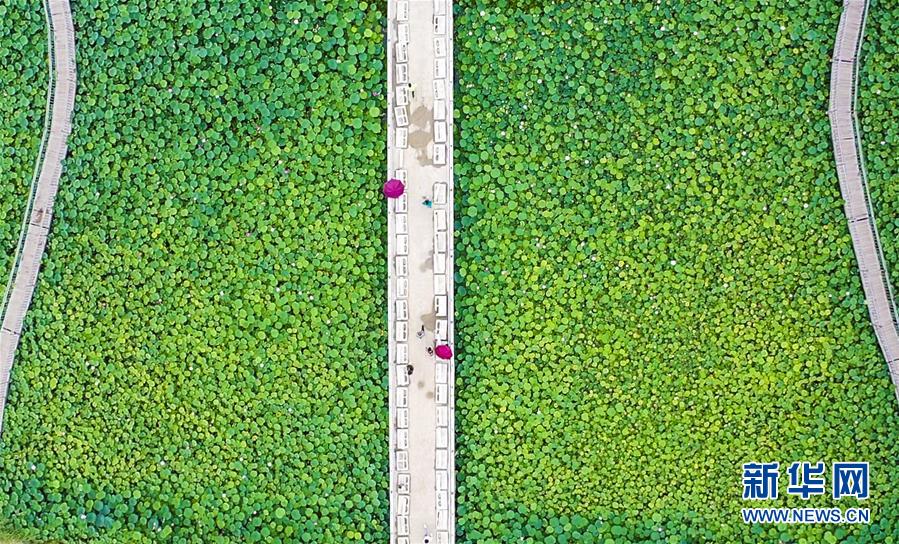 8月6日,游客在河北省永清縣里瀾城鎮(zhèn)金華湖觀賞荷花(無人機(jī)照片)。夏日時(shí)節(jié),河北省永清縣里瀾城鎮(zhèn)金華湖荷塘的荷花爭相開放,吸引市民和游客前來游玩觀賞。新華社記者李曉果攝
