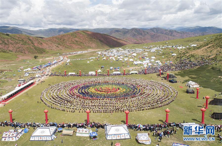 西藏首屆弦子舞展演現(xiàn)場(8月7日攝,無人機照片)。當日,西藏首屆弦子舞展演在昌都市芒康縣舉行。眾多演員同臺獻藝,表演國家級非物質文化遺產弦子舞,吸引西藏各地的群眾前來觀看。新華社記者孫非攝